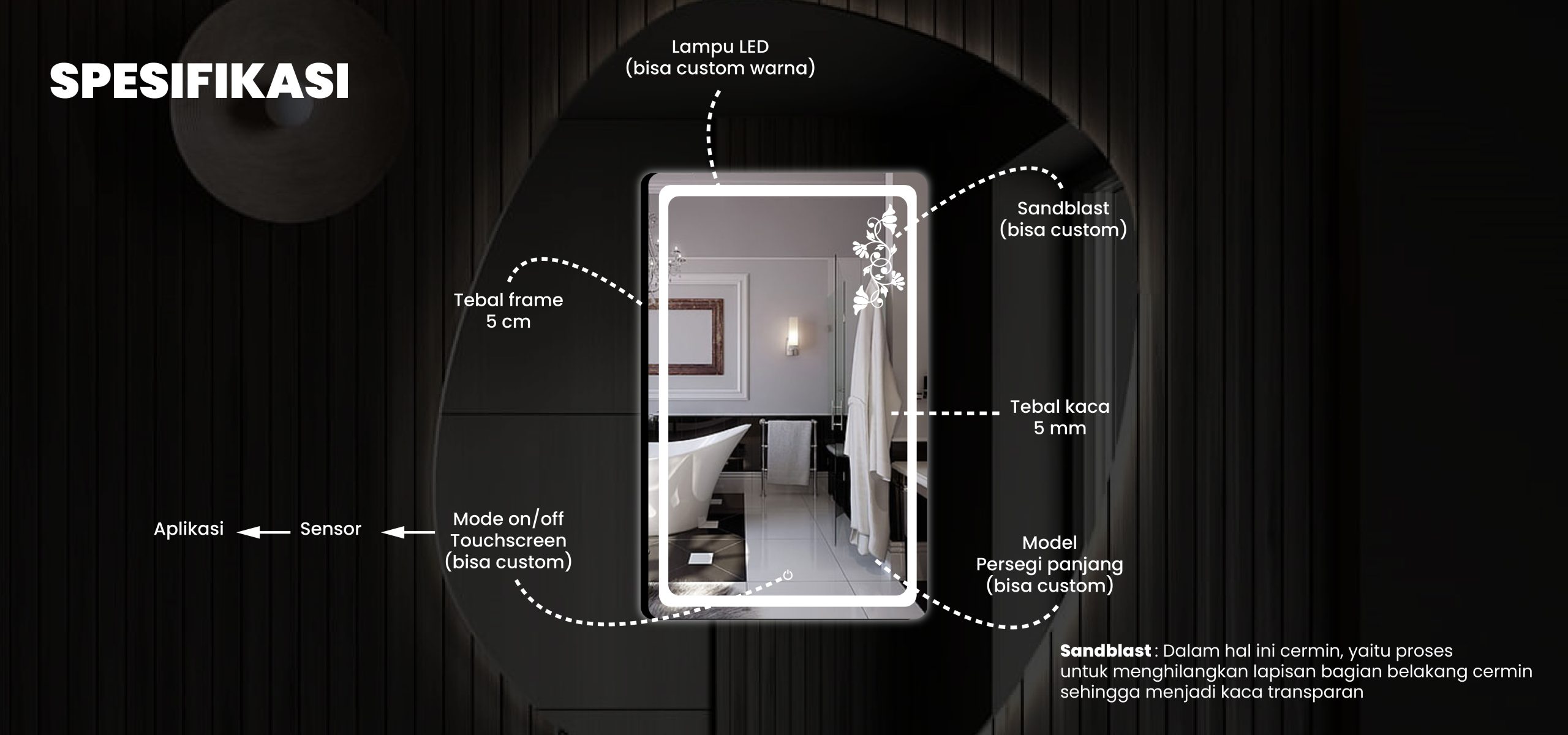 Sandblast: Dalam hal ini cermin, yaitu proses untuk menghilangkan lapisan bagian belakang cermin sehingga menjadi kaca transparan